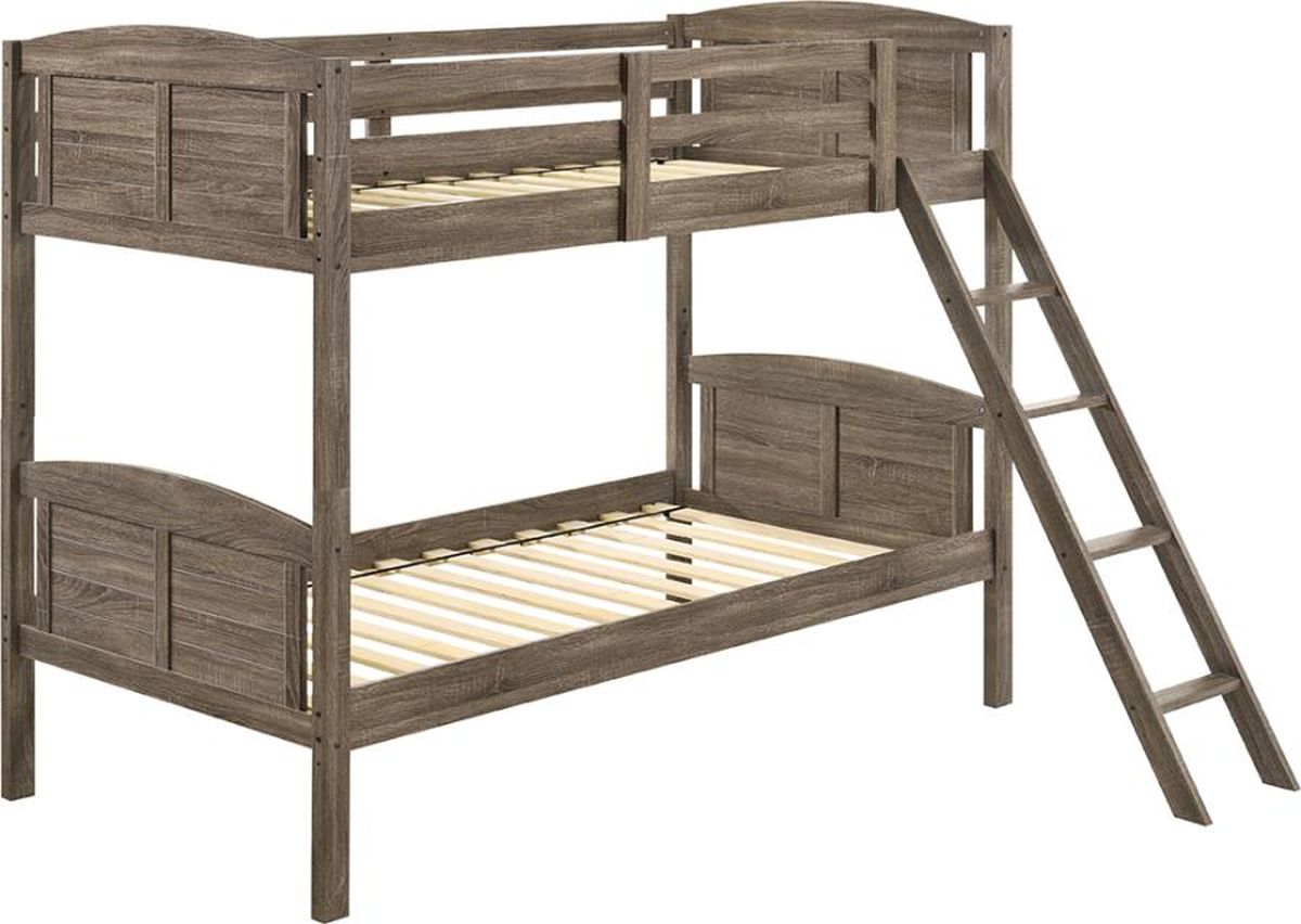 A casual country vibe carries the space with this rustic bunk bed, perfect for compact bedrooms and shared sibling spaces. A weathered brown finish lends a neutral hue to transform a space into a serene, restful retreat.Read More