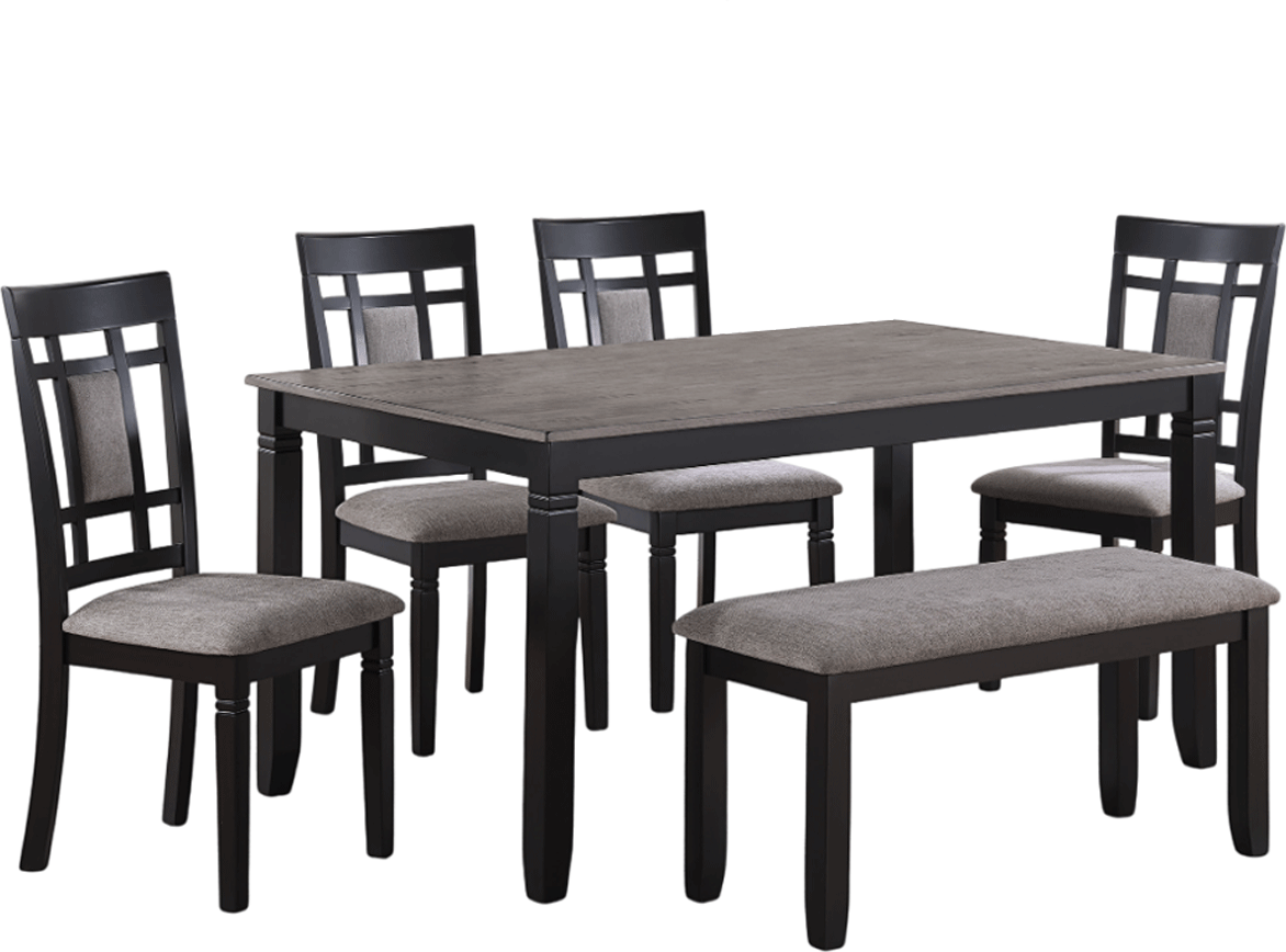 Set includes dining table, bench, and 4 chairs