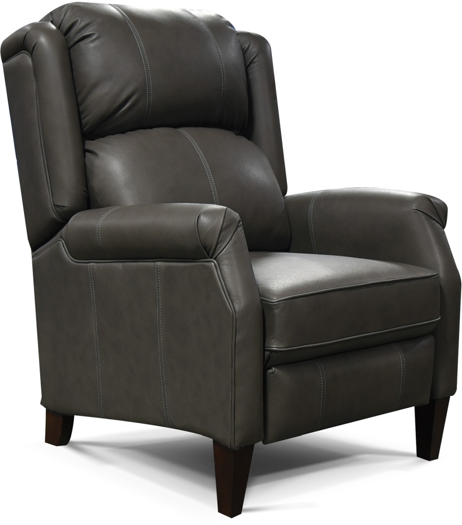 Transitional styling in luscious leather, our Kora high leg recliner offers generous comfort and makes a statement. We pull the look together with tapered wood legs, a pub back, and an optional antique brass nailhead trim.Read More