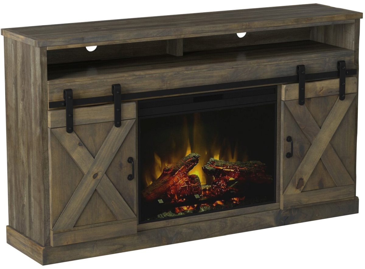 The Farmhouse 66" Fireplace TV Stand combines classic charm with modern functionality, featuring rustic rolling barn doors and chic metal accents. Designed to support TVs up to 80 inches, it offers ample storage for all your media components.Read More