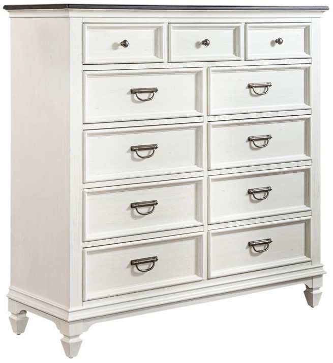 Design possibilities are endless with the Allyson Park chesser. This piece features a wire brushed white finish with charcoal tops with planked accents. The chesser has eleven wood framed full extension drawers including three smaller drawers across the top of the case that have felt lining and still offer plenty of deep storage.Read More
