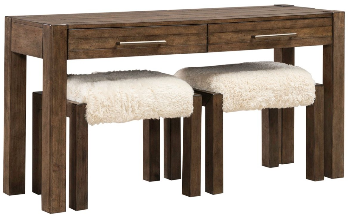 Seamlessly blend form and function with the Broadmore alternate 3 piece set. Crafted with excellence using Pine solids with Rustic Birch veneers, this set features a Cobblestone Brown finish and includes the console table and 2 upholstered console stools.Read More