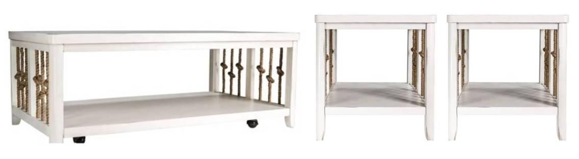 Enjoy family game night around the Dockside ll cocktail table in coastal style. Crafted of poplar solids and birch veneers finished white. Features knotted rope end panels and wormhole distressing, softly rounded pilasters flow into tapered feet, appealing planked top with a bottom shelf for additional storage.Read More