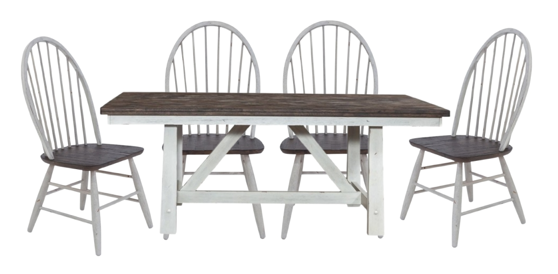 Sitting pretty with the Farmhouse five-piece trestle table set. Crafted of rubberwood solids and veneers, this kit includes the fixed-top trestle table and four Windsor back side chairs. The trestle table features a timeless heavy distressing with a two-tone white and wood-tone finish with a planked top.Read More