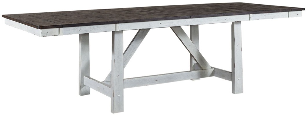 Gather the whole family with the Farmhouse trestle table. Crafted of rubberwood solids and veneers, this piece features a timeless heavy distressing, two removeable 18" leaves to comfortably seat up to eight, an "x" style trestle base, and a solid wood top.Read More