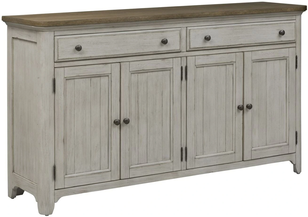 Enhance your dining space with a classic look and casual feel with the Farmhouse Reimagined server. Crafted of pine and poplar solids with hickory and pine veneers, this piece features a timeless antique white finish with a chestnut top and heavy wire brush distressingRead More