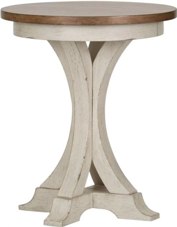 Morning coffee just got better with the Farmhouse Reimagined round chair side table to set your coffee cup on. Crafted of pine and poplar solids with pine and cathedral hickory veneers, this piece features an antique white finish with a chestnut top, consumer friendly assembly, anchored by a uniquely shaped tapered leg design.Read More