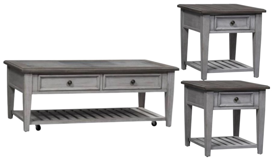 Full extension fully stained interior drawers and a slat bottom shelf for additional storage, square tapered legs, and cocktail is castered for easy movability. This style will complement any décor from cottage to traditional. Kit consists of rectangle ceiling tile cocktail table and two end tables.