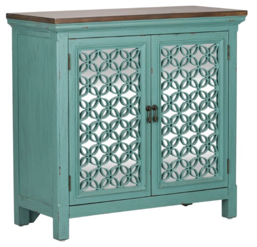 Transform your home with the Kensington 38" accent cabinet. Crafted of Eucalyptus solids and Ash veneers in a wire brushed Turquoise finish and Spice wood tone top. Features two mirrored doors with decorative floral pattern overlays, block feet and one concealed fixed shelf behind doors.Read More