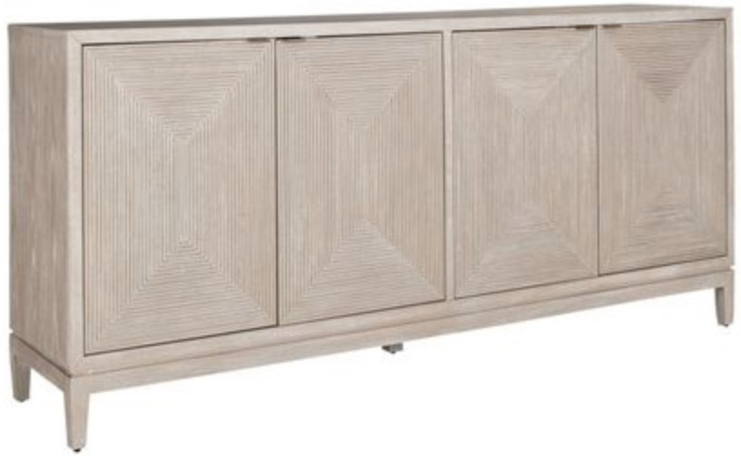 Infused with emotion, the Kinsley four-door accent cabinet is sure to turn heads. Crafted with excellence using rubberwood solids with split heart white oak veneers, this piece features a Washed Taupe and Silver Champagne finish. The unique decorative pattern resin door fronts are the showstopper.Read More