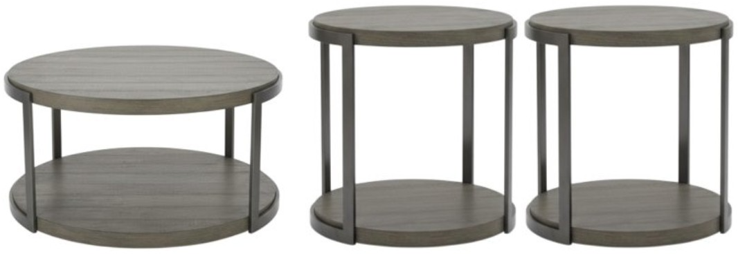 Design possibilities are endless with the Modern View round cocktail table and two end tables. This kit features a gauntlet gray finish. The cocktail table and end tables feature wire brush distressing, dark pewter metal bases, open shelf design, and casters added to the cocktail table for easy maneuverability.Read More